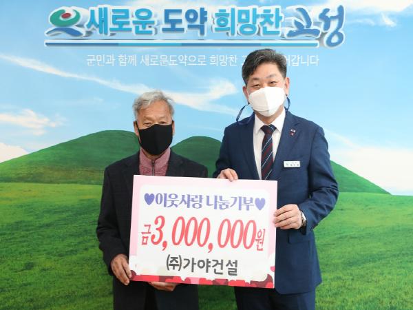 ㈜가야건설(대표 최종주)은 12월 30일 고성군청을 방문하여 어려운 이웃을 위해 성금 300만 원을 전달했다.