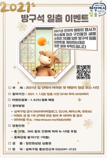 이승로 성북구청장은 “해맞이 행사 취소로 댁내에서 새해를 맞이할 구민들의 아쉬운 마음을 달래고자 비대면 이벤트를 준비하게 되었다”면서 “저마다의 소원을 담은 새 해를 이웃과 공유하며 설렘과 행복이 가득한 2021 새해 맞이하시길 바란다 ”고 말했다.