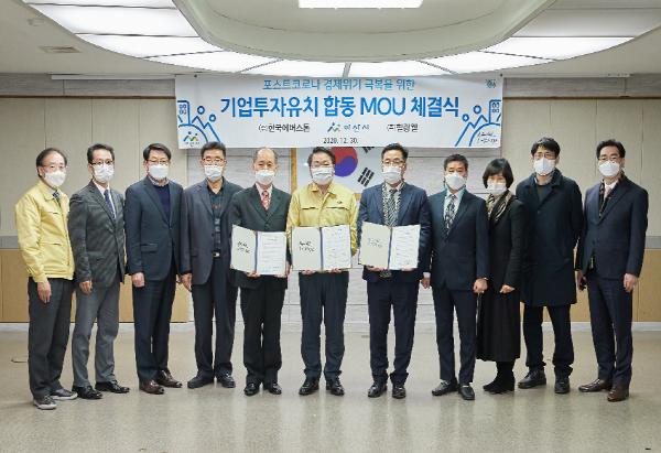 아산시가 30일 ㈜한국에버스톤(대표이사 유성환) ·㈜힐링웰(대표이사 김선호)과 포스트 코로나 경제위기 극복을 위한 합동투자 MOU를 체결했다.