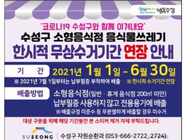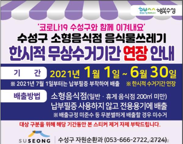 대구광역시 수성구는 코로나19 방역강화로 지역 소상공인의 경영난이 계속되자 12월 31일까지 시행 예정이던 ‘소형음식점 음식물쓰레기 무상수거’를 내년 6월까지 연장한다고 30일 밝혔다.