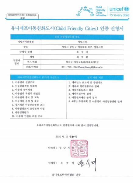 성남시는 아동친화도시 조성을 위해 지난 30일 ‘유니세프 아동친화도시’ 인증 신청서를 제출했다고 밝혔다.
