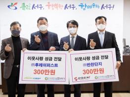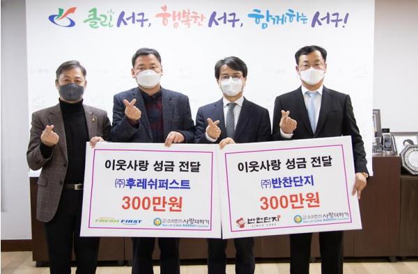 인천 서구 식품제조업체인 ㈜반찬단지와 ㈜후레쉬퍼스트는 지난 28일 인천 서구에 이웃사랑 성금 600만 원을 전달했다.