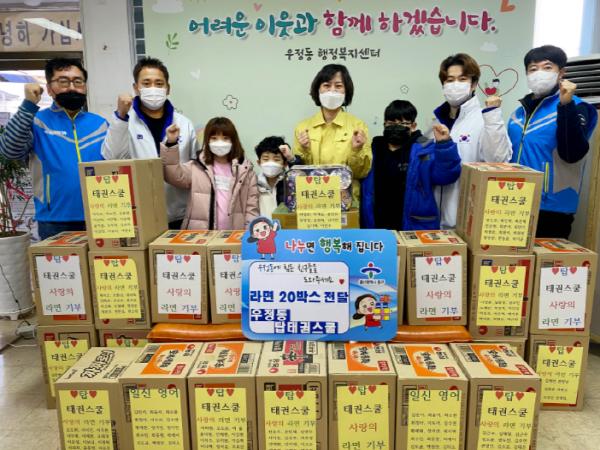 울산 중구 우정동 소재 탑태권스쿨(관장 김형민)은 30일 우정동 행정복지센터를 방문해 라면 20박스를 기탁했다.