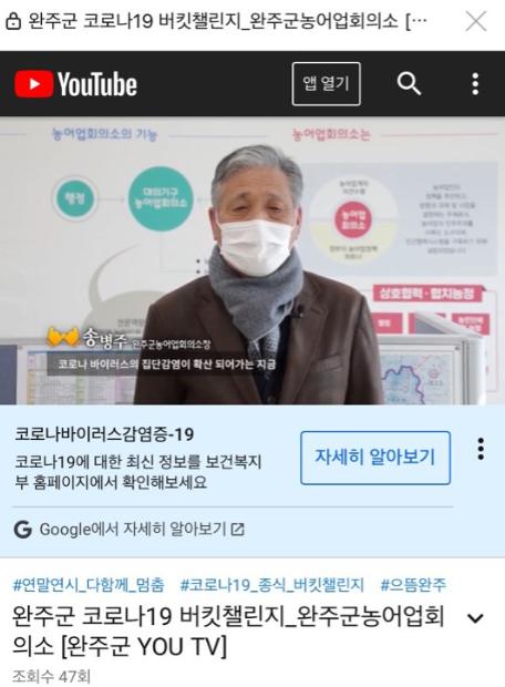 앞서 완주산단진흥회 김영보 회장의 영상 버킷 챌린지를 시작으로 전북경제살리기 도민회의 김종년 완주본부장, 이근석 완주소셜굿즈센터장, 완주청년거점공간 림보 등 완주군 거점 단체들의 코로나 확산 멈춤을 위한 구호를 외치며 군민의 참여를 독려했다.