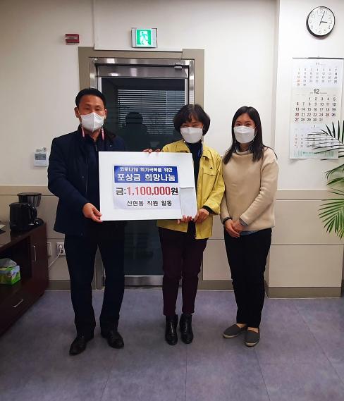 윤혜숙 신현동장은 “코로나19로 힘든 시기, 수상의 기쁨도 이웃과 함께 나누고 싶다는 직원들의 의견을 모아 결정하게 되었는데, 따뜻한 마음을 모아준 직원들에게 고마움을 전한다”며 “코로나19로 어려운 주민을 위해 긴밀하게 협력·소통해 내년 일자리 창출과 주민이 모두 행복한 복지공동체마을을 만들 수 있도록 노력하겠다”고 말했다.