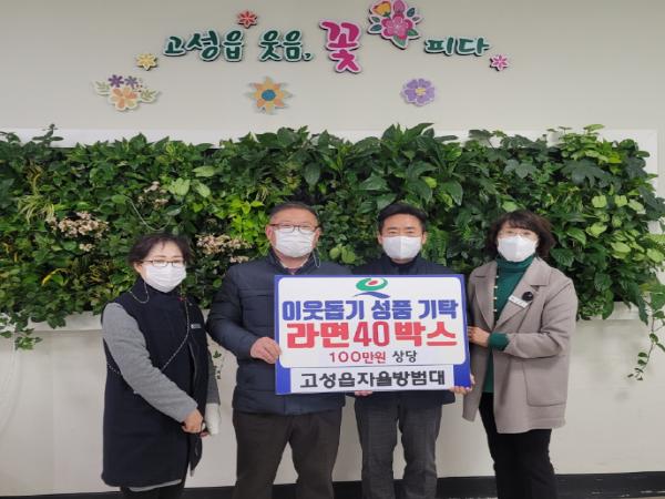 고성읍 자율방범대(대장 유범석)은 12월 30일 동절기 어려운 이웃에게 전달해 달라며 100만 원 상당의 ‘사랑의 라면’ 40박스를 고성읍행정복지센터에 기탁했다.