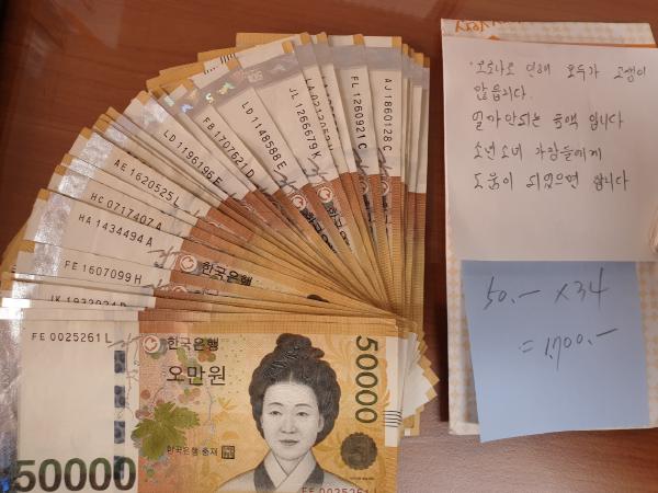 우편 봉투 안에는 5만원 지폐 34장과 함께 ‘코로나로 인해 모두가 고생이 많습니다. 얼마 안 되는 금액입니다. 소년소녀 가장들에게 도움이 되었으면 합니다’고 적힌 메모지도 함께 발견됐다.