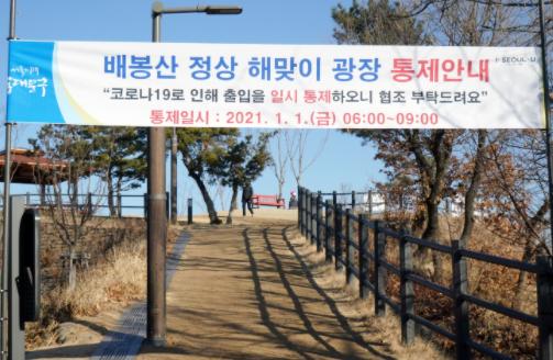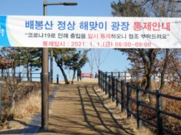 배봉산 해맞이 행사 취소에도 불구하고 해맞이 인파가 모일 것으로 예상되어 구는 1월 1일 오전 6시~9시까지 배봉산 정상 진출입로 2개소를 폐쇄하고 일시 통제에 따른 안내 요원을 배치한다.