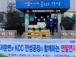 KCC 안성공장이 안성시 서운면 내 취약계층을 돕기 위해 지난 30일 쌀(10kg) 100포와 라면(1상자 40개) 50상자를 서운면에 기탁했다.