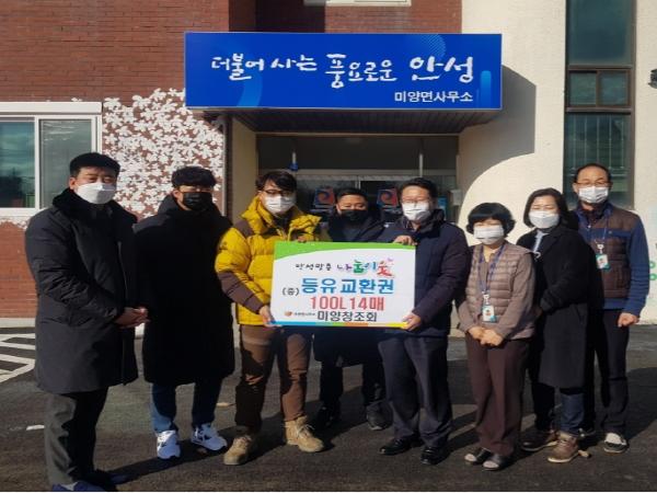 지난 30일 미양초등학교 졸업생 모임 창조회에서 회원들이 정성껏 모은 회비로 100리터 등유교환권 14매(100만원 상당)를 미양면에 전달했다.