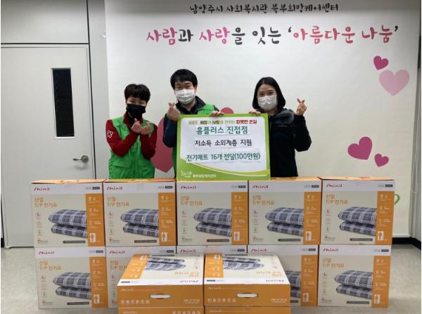 남양주시 진접읍 소재 홈플러스 진접점(대표 임일순)은 지난 30일 지역사회 저소득 이웃의 겨울나기를 위하여 100만원 상당의 전기매트 16개를 북부희망케어센터(센터장 대행 김희정)에 전달하였다.