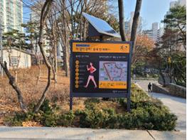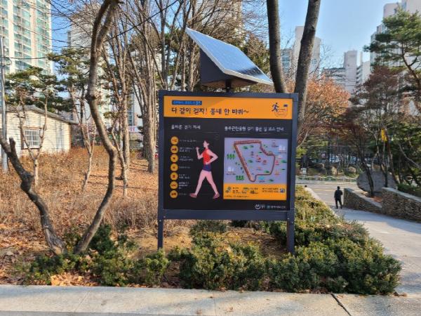 안내판에는 걷기코스지도, 코스별 총거리, 소모 칼로리량, 올바른 걷기자세, 걷기 전후 스트레칭 방법 등 걷기운동에 유용한 정보를 담고 있다.