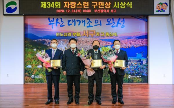 부산 서구는 ‘제34회 자랑스러운 구민상’ 수상자에 △ 애향부문 김용구 서구체육회 회장(64) △ 봉사부문 임병율 서대신4동 우리동네역사알기 회장(56) △ 희생부문 최덕원 충무동 새마을지도자협의회 회장(56)을 선정해 지난 31일 시상식을 가졌다.