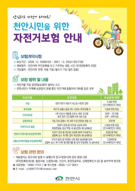 천안시에 주민등록이 돼 있는 시민이면 누구나 별도의 가입절차 없이 보험에 가입되며 외국인등록자도 포함된다. 천안시는 2017년 처음 가입을 시작으로 매년 자전거안심보험에 가입해 시민들의 안전을 보장해왔다.