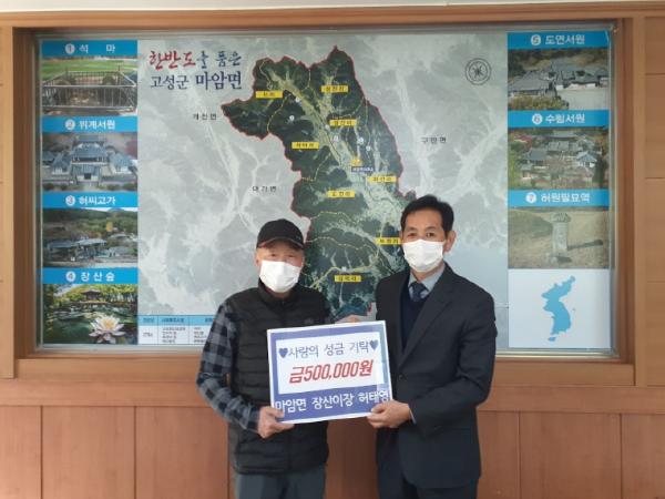 고성군 마암면(면장 김종환) 장산마을 허태영 이장은 12월 31일 마암면사무소를 방문하여 겨울철 어려운 이웃을 돕는 데 써달라며 성금 50만 원을 기탁했다.