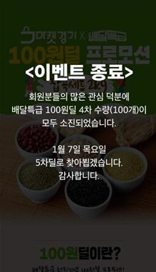 경기도주식회사는 경기농식품유통진흥원과 함께 경기도 농식품을 선착순 100명에 100원(배송료 포함)에 판매하는 ‘배달특급X마켓경기 100원딜’ 행사가 첫 시작부터 4차까지 모두 1분 만에 완판 됐다고 31일 밝혔다.