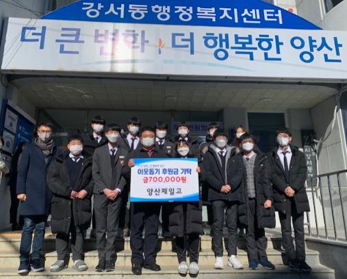 강서동행정복지센터(동장 심주석)는 31일 양산제일고(교장 권구호) 글마루반 학생들이 연말연시를 맞아 이웃돕기 성금 70만원을 기탁했다고 밝혔다.