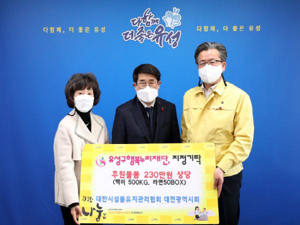 대전 유성구는 지난 31일 구청 행복사랑방에서 대한시설물 유지관리협회 대전광역시회(회장 이상욱)가 유성구행복누리재단에 백미 500kg, 라면 50박스를 기탁했다고 밝혔다.