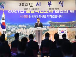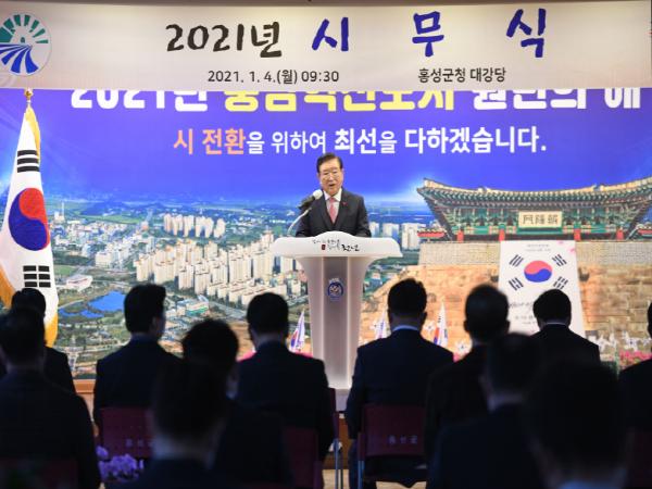 김석환 홍성군수는 4일 오전 9시 30분 군청 대강당에서 시무식을 열고 2021년을 충남혁신도시 지정 원년의 해로 선포했다.