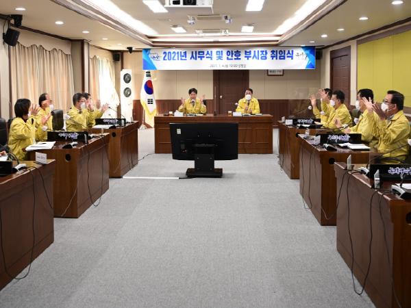이 날 시무식은 국·단·소장 등 최소 인원만 참석한 가운데 영상으로 진행됐으며, 지난 1년 간 코로나19로부터 지역사회와 시민의 안전을 지키기 위해 애써온 직원의 노고를 격려하고, 2021년 새해를 맞아 시민이 더 행복한 논산을 만들기 위한 서로의 의지를 다지는 시간으로 이뤄졌다.