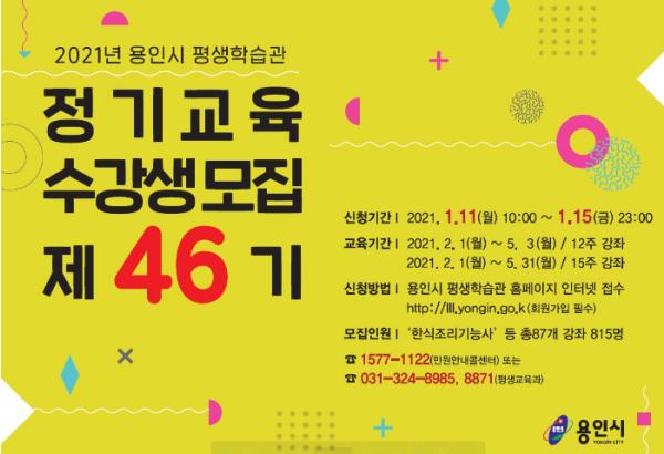 용인시는 수지구 풍덕천동 평생학습관에서 제46기 정기교육에 참여할 수강생 815명을 11일부터 15일까지 모집한다고 밝혔다.