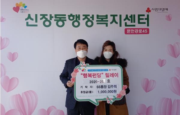유영만 신장동장은 "코로나19의 장기화로 어려운 경제 여건 속에서도 이웃사랑의 나눔을 실천해 주신 김주희 총무님께 깊이 감사드린다.”고 말했다.