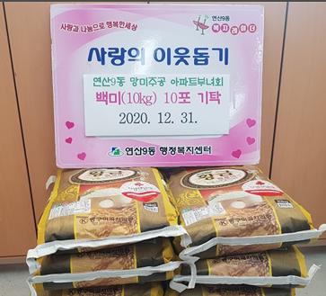 연제구 연산9동은 지난달 31일 망미주공아파트부녀회로부터 취약계층을 위한 백미 10kg 10포(30만 원 상당)를 기탁받았다고 전했다.
