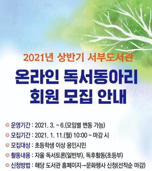 용인시 서부도서관은 22개 온라인 독서동아리에서 활동할 회원을 오는 11일부터 선착순으로 모집한다고 4일 밝혔다.