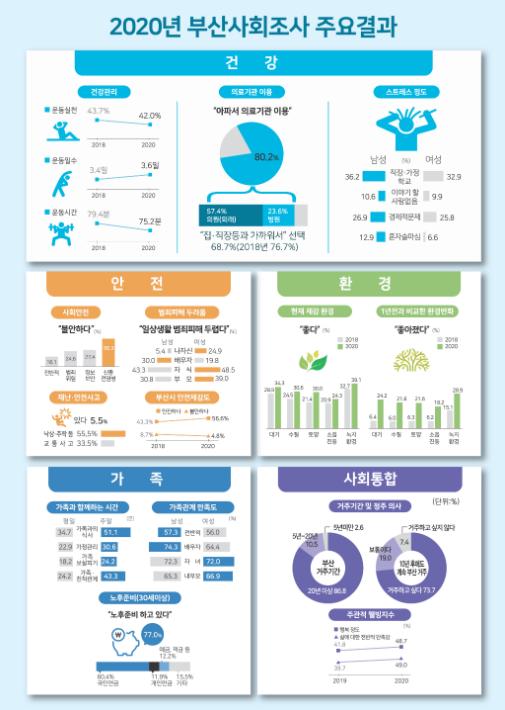 ‘부산사회조사’는 시민생활, 시민의식의 실태와 수준을 파악하기 위해 1996년부터 매년 시행하고 있다. 2020년에는 1만7천860개 표본가구를 대상으로 건강, 안전, 환경, 가족, 사회통합 5개 부문 136개 항목에 대한 조사를 진행했으며, 부문별 결과는 다음과 같다.