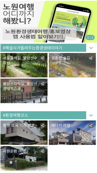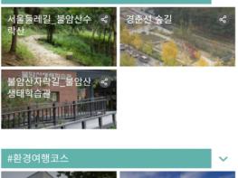 ‘환경 여행코스’에서는 환경 교육기관 여행, 에너지 여행, 자원순환 여행 등 3가지 여행코스에 대한 안내가 제공되고 있으며, 마지막으로 생태여행 코스에서는 중랑천 물길 여행, 영축산 무장애 숲길 힐링로드, 당현천 물길 여행 등 10개의 여행코스를 만나볼 수 있다.