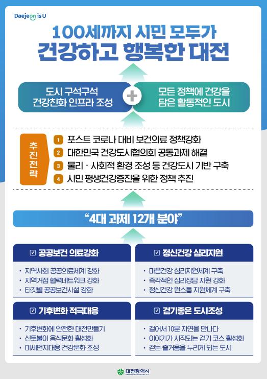 시에 따르면 올해 건강도시 비전으로 ‘100세까지 시민 모두가 건강하고 행복한 대전’을 선정했으며, 이에 따른 4대 전략으로는 ① 포스트 코로나 대비 보건의료 정책강화 ② 대한민국건강도시협의회 공동과제 해결 ③ 물리ㆍ사회적 환경 조성 등 건강도시 기반 구축 ④ 시민 평생건강증진을 위한 정책 추진으로 정했다.