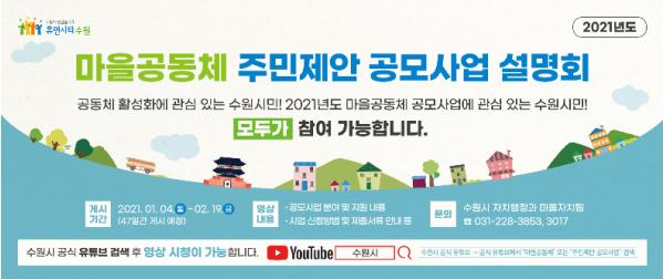 수원시가 ‘2021년도 마을공동체 주민제안 공모사업’을 온라인으로 알린다.
