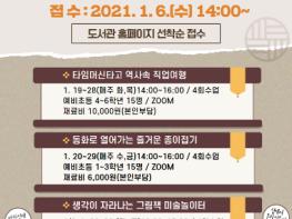 수강 신청은 안양시립도서관 홈페이지(lib.anyang.go.kr)에서 1월 6일(수) 오후 2시부터 선착순으로 접수받는다. 재료비 등 특강과 관련된 자세한 사항은 도서관 홈페이지를 참고하면 된다.
