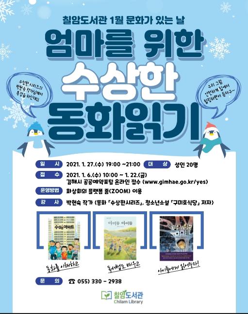 김해시 칠암도서관(관장 박은숙)은 1월 문화가 있는 날을 맞이하여 박현숙 작가와 함께 성인을 대상으로 화상회의 플랫폼(줌/ZOOM)을 이용한 “엄마를 위한 수상한 동화읽기”프로그램을 운영한다고 밝혔다.
