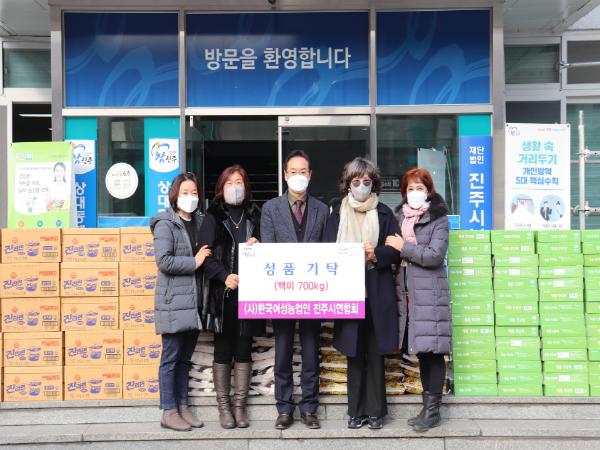 상봉sea(바다)마트(대표 이우한)에서 KF94 마스크 1만매(환가액 700만원), 한국여성농업인 진주시연합회(회장 김명순)에서 백미(10kg) 70포, 계란 100판(환가액 271만원), 진주시 4-H 연합회(회장 강호준)에서 백미(5kg) 80포, 라면 80박스(환가액 188만원), 국토안전관리원(원장 박영수)에서 방역복 외 3종(환가액 1660만원)을 기탁했다.