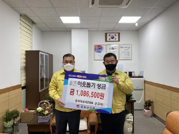 평화동에 소재한 동아차유리는 지난 4일 평화남산동주민센터를 방문해 어려운 이웃이 따뜻한 겨울을 보낼 수 있도록 보탬이 되고 싶다며 현금1,086,500원을 기탁하며‘희망2021 나눔캠페인’에 참여했다.