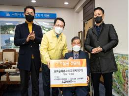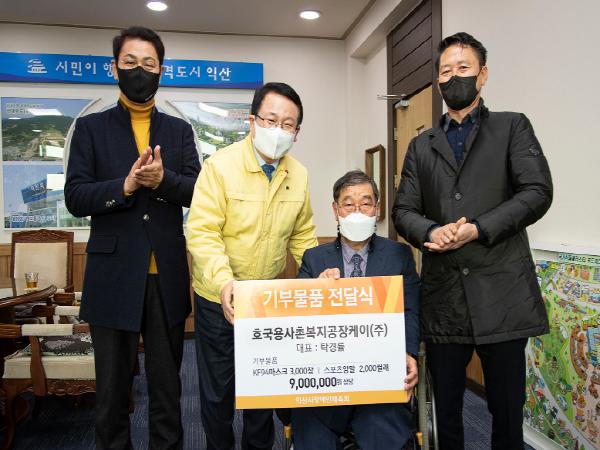 이날 열린 기탁식에는 정헌율 익산시장과 기탁업체인 호국용사촌복지공장케이 주식회사 탁경률 대표 등 5명이 참석해 약 9백만원 상당의 KF94 마스크 3천장, 스포츠 양말 2천켤레 후원물품을 기탁했다.