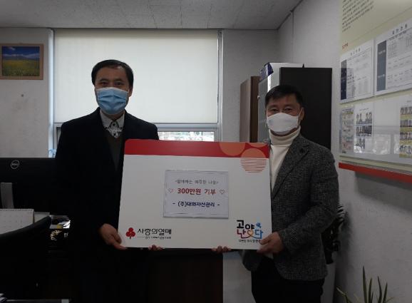 ㈜대화자산관리는 사회적 기업으로 건물종합관리, 경호·경비, 소독을 전문으로 하며, 코로나로 힘들어하는 우리 이웃들이 따뜻한 겨울을 보낼 수 있도록 작은 정성을 모아 성금을 기부했다.