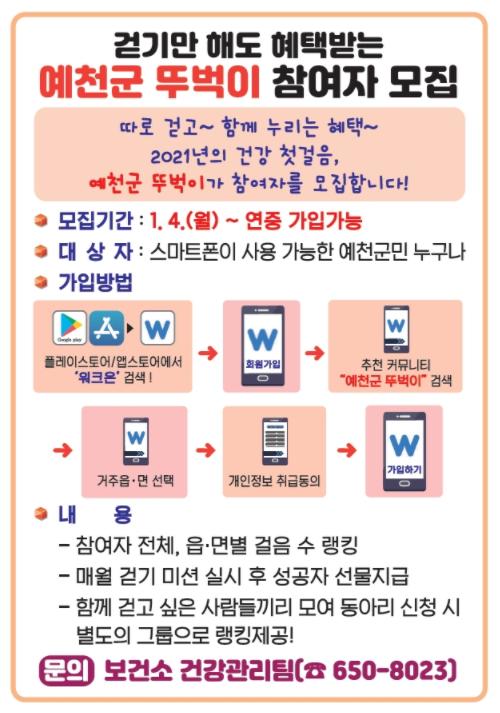 참여방법은 예천군민이라면 누구나 별도로 신청서를 제출할 필요 없이 스마트폰에 ‘워크온’ 앱을 설치하고 회원가입 후 추천 커뮤니티에서 ‘예천군 뚜벅이’를 검색해 가입하면 된다.