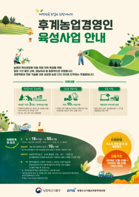 이정주 농축산과장은 “자금지원과 교육지원 등 혜택이 많은 만큼 후계농업경영인에 해당되는 농업인들은 많이 신청하기 바란다”고 전했다.