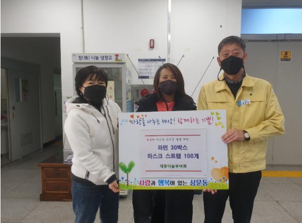 대동다숲 부녀회는 지난 4일 저소득세대에 전달해 달라며 라면 30박스와 마스크 스트랩 100개를 상문동에 기탁했다.