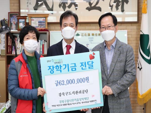 이날 전달식에는 박겸수 강북구청장과 공단 이사장 및 노동조합대표 등이 참석했다. 전달된 금액은 총 6천2백만 원이다. 장학금은 공단 임직원 156명의 2020년 임금인상액을 기부해 조성한 것이다. 공단은 2020년 노사 임금협상 시 5.7%의 인상분 중 1%를 강북구꿈나무키움장학재단에 기부하는 것으로 사전 합의한 바 있다.