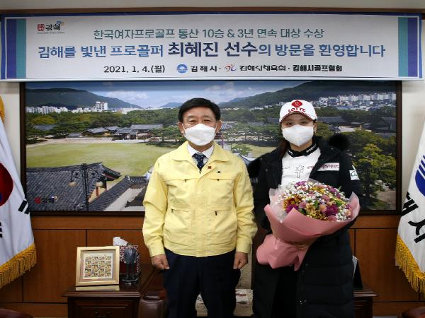 우리시 동광초 출신이자 2024년 제105회 전국체전 홍보대사인 프로골퍼 최혜진 선수가 코로나19로 힘든 시기를 보내고 있는 시민들에게 희망의 메시지를 전하기 위해 김해시를 방문했다.