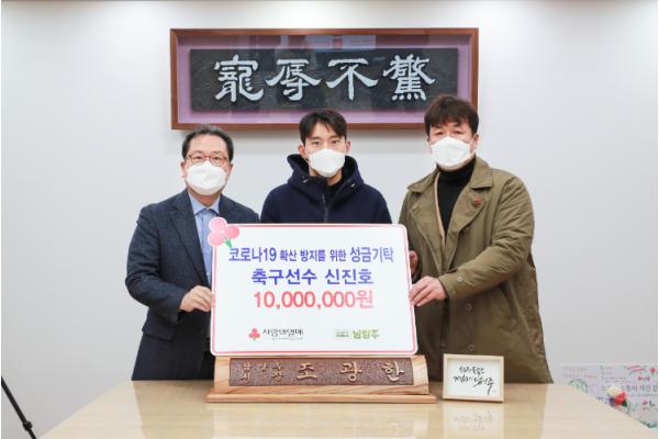 축구선수 신진호(울산 현대 축구단 소속)가 5일 코로나19로 고통 받고 있는 남양주시의 취약계층을 응원하고자 경기북부사회공동모금회를 통해 1천만원을 기부했다.