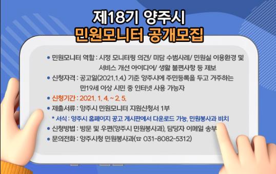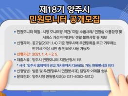 양주시는 오는 2월 5일까지 시정전반에 대한 시민들의 발전적인 의견을 수렴하기 위해 제18기 양주시 민원모니터를 모집한다.