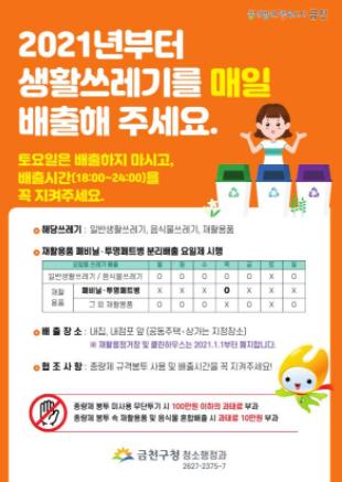 이에 금천구 주민들은 토요일을 제외한 모든 요일에 일반생활쓰레기, 음식물쓰레기, 재활용품 등 생활쓰레기를 배출할 수 있다.