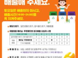 각 가정에서는 일반생활쓰레기와 음식물쓰레기는 각각의 종량제봉투에, 재활용품은 투명한 봉투에 담아 오후 6시부터 자정까지 내 집 앞이나 상가 앞에 배출하면 된다.