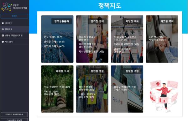 ‘성동 빅데이터 센터’는 지난 2년간 주민 생활과 밀접한 도시데이터를 활용, 데이터 기반 과학 행정의 핵심역할을 수행해왔다. 기초지자체에서는 최초로 온?오프라인 데이터를 연계한 ‘성동구 빅데이터 플랫폼’을 개발하고 13개 분야 122개 빅데이터를 활용 중이다. 이를 기반으로 지난해 9월에는 성동구 지도 위에 정책별 빅데이터를 직관적으로 표현해 직원들이 정책 수립 시 편리하게 활용할 수 있도록 182개의 정책지도도 만들었다. 최근에는 유동인구 및 카드 매출, 개인?기업 신용정보 데이터 등 민간 빅데이터까지 플랫폼에 탑재해 과학적 데이터에 근거한 보다 정밀한 정책 수립이 가능해 졌다.