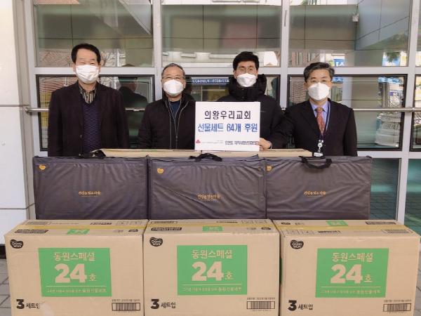 의왕우리교회에서 코로나19로 인해 어려움을 겪고 있는 이웃에게 전달해 달라며 5일 선물세트(참치·햄) 64개를 오전동 주민센터에 전달했다.