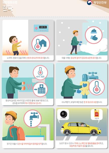 이번 한파로 노약자나 거리 노숙인에게는 한랭 질환이 우려된다. 또한, 가정에서는 계량기·수도관 동파나 보일러 파손, 정전 등과 같은 시설물 피해와 겨울철 농작물·양식장 등 냉해도 주의할 필요가 있다.